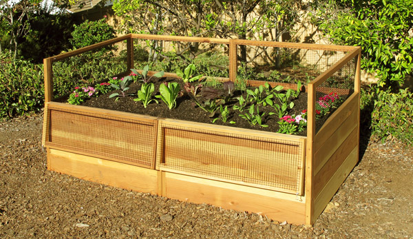 - Front fence panels are hinged and may be folded down for easy access to plants and soil