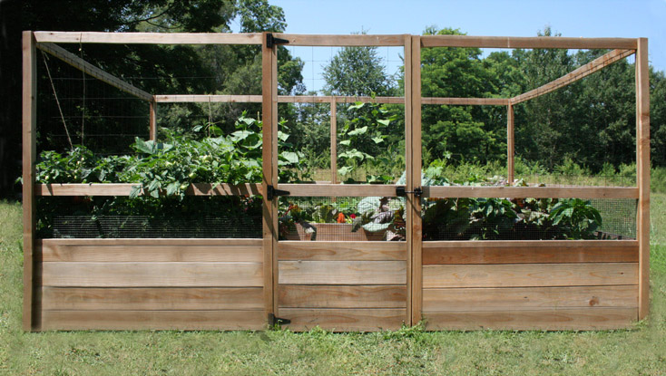 4"x4" Reach-Through Trellis Netting The trellis is backed with sturdy reach-through 4"x4" netting, so you can harvest all vegetables from the inside of the fenced garden, without having to walk behind the structure. The trellis is ideal for growing peas, green beans, tomatoes and cucumbers.